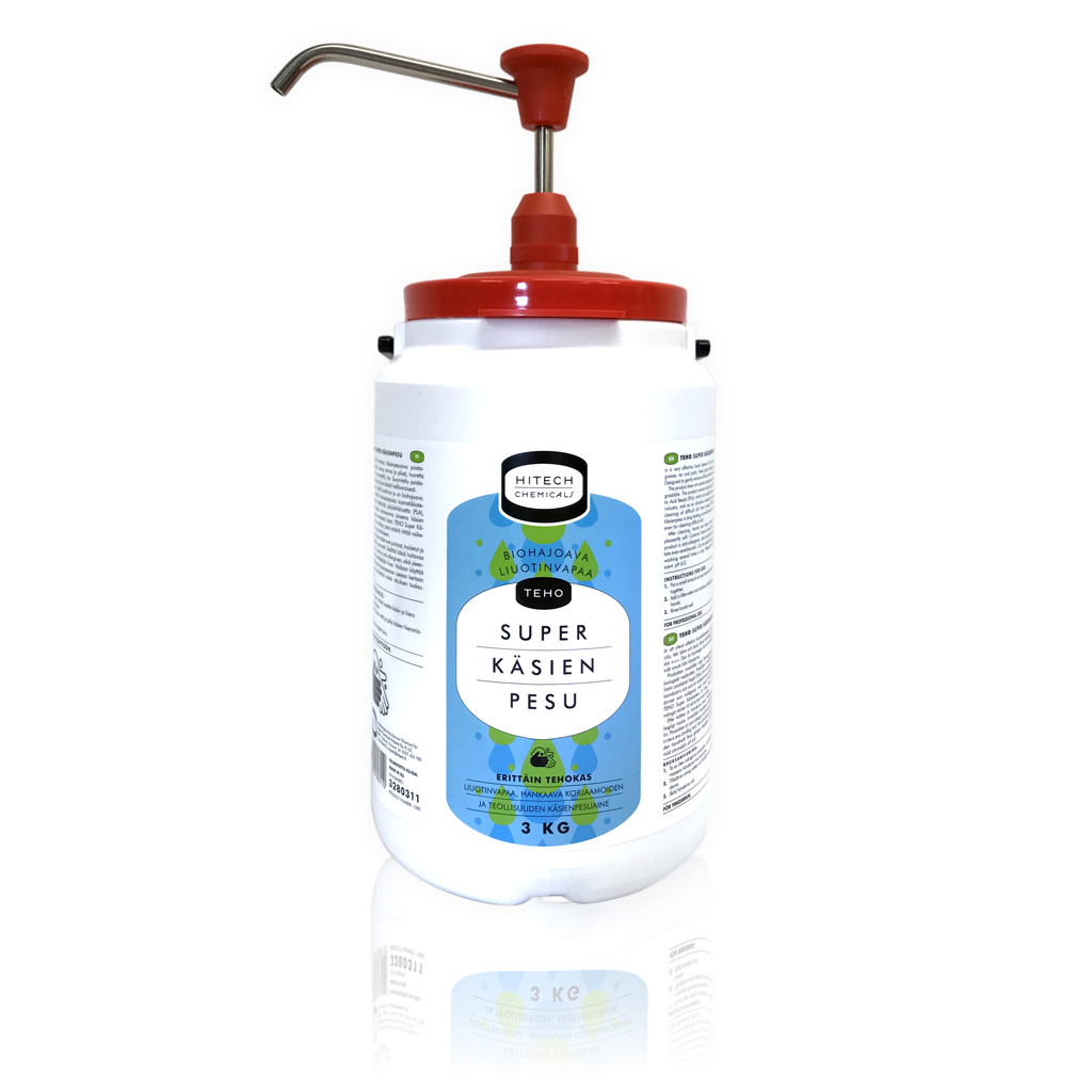 TEHO Super Käsienpesu on erittäin tehokas liuotinvapaa, hankaava käsienpesuaine korjaamoihin, teollisuuteen ja muihin kohteisiin, joissa vaikea lika tulee poistaa hellävaraisesti mutta tehokkaasti. Se poistaa öljyn, rasvan, tervan, pikeen, tuoreen maalin, jarrunesteen ja muun raskaan lian nopeasti ja ihoa ärsyttämättä.