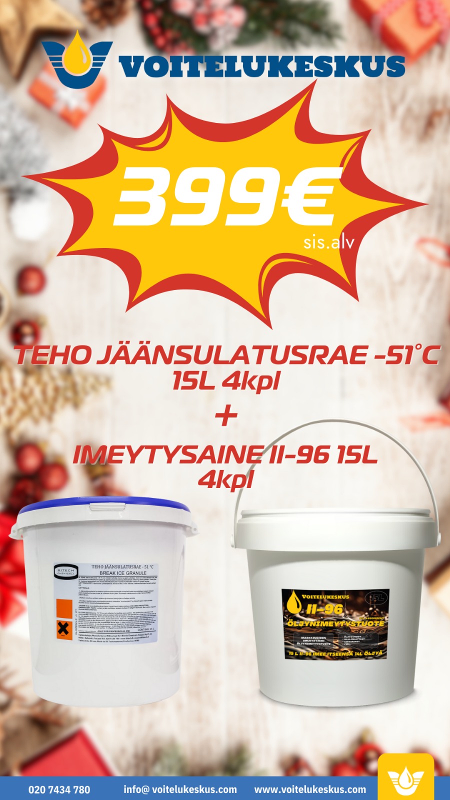 I Luukku 9-erbjudandet får du fyra (4) stycken TEHO-issmältningsgranulat i 15-litersbehållare och fyra (4) stycken II-96-absorbent i 15-litershinkar i ett paket.